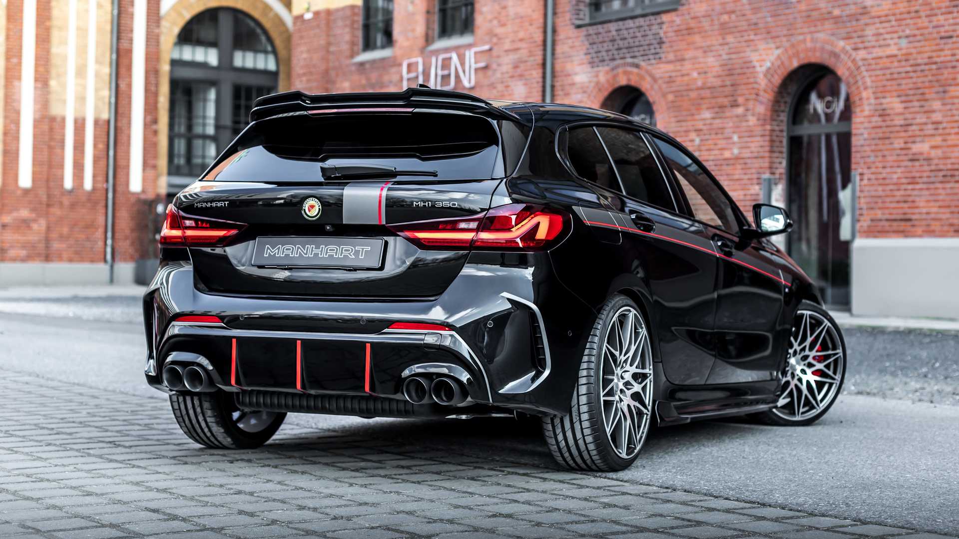Las actualizaciones visuales incluyen un nuevo juego de llantas Manhart GTS Style de 20 pulgadas. Están calzadas con neumáticos 235/30 ZR20 en ambos ejes. Se complementan con una suspensión rebajada con muelles H&R que acercan al Serie 1 al suelo en 30 mm. También se ofrece un equipo de frenos mejorado y el nuevo paquete de carrocería de Maxton Design.