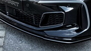 El kit incluye un splitter delantero (169 €), faldones laterales aerodinámicos con aletas integradas (169 €), un spoiler de techo doble (129 €) y un difusor trasero (179 €). Una vez más, no faltan los vinilos de Manhart en colores plata y rojo. En la parte trasera encontramos tubos de escape cuádruples acabados en negro mate con un diámetro de 90 mm (2.085 €).