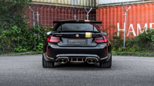 En su exterior, el BMW M2 Competition del especialista se viste de negro y dorado para obtener una apariencia mucho más siniestra. Busca parecerse al M2 CS y su altura ha disminuido gracias a una suspensión deportiva coilover de tres vías de KW. Se combina con un juego de llantas de aleación de 19 pulgadas calzadas con gomas deportivas.