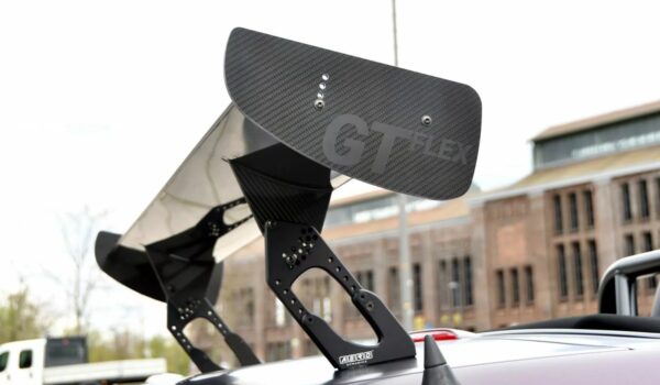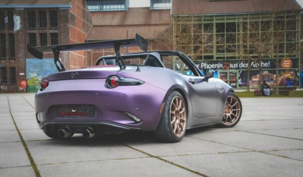 El propietario de este MX-5 se propuso hacer su deportivo nipón lo más ligero, aerodinámico y capaz posible. Es por ello por lo que podemos apreciar interesantes cambios en la carrocería como las tomas de aire del capó, las dos colas de escape centrales y, por supuesto, el alerón Aerodinámica GT-Flex de proporciones bíblicas que cambia por completo la vista trasera del roadster.