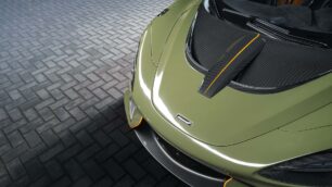 Entre los elementos de fibra de carbono podemos ver un nuevo divisor frontal , carcasas para los espejos retrovisores, faldones laterales, un remozado capó y salidas de ventilación en los guardabarros delanteros. Contrastan con el color Badlands Green de la carrocería, así como con varios detalles en naranja en el divisor, las aletas, el capó, el techo, el alerón y el difusor trasero.