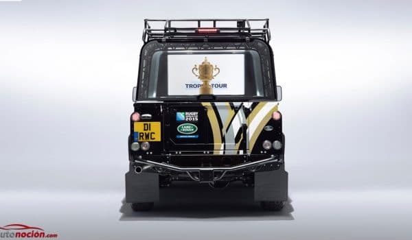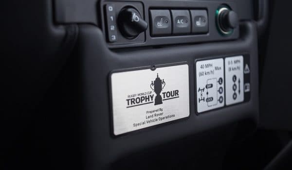Exteriormente, este Defender luce una carrocería en color negro con elementos característicos del Mundial de Rugby, como el logo en las puertas delanteras o una decoración gris y dorada en la parte trasera. Contribuyen al aspecto offroad el cabestrante frontal, la protección de aluminio, un ‘snorkel’ y la protección trasera; mientras que el interior destaca por sus asientos de cuero negro Windsor en contraste con la inscripción ‘Rugby World Cup Trhopy Cup‘ bordada en azul y oro. Remata el conjunto la placa distintiva del Mundial.