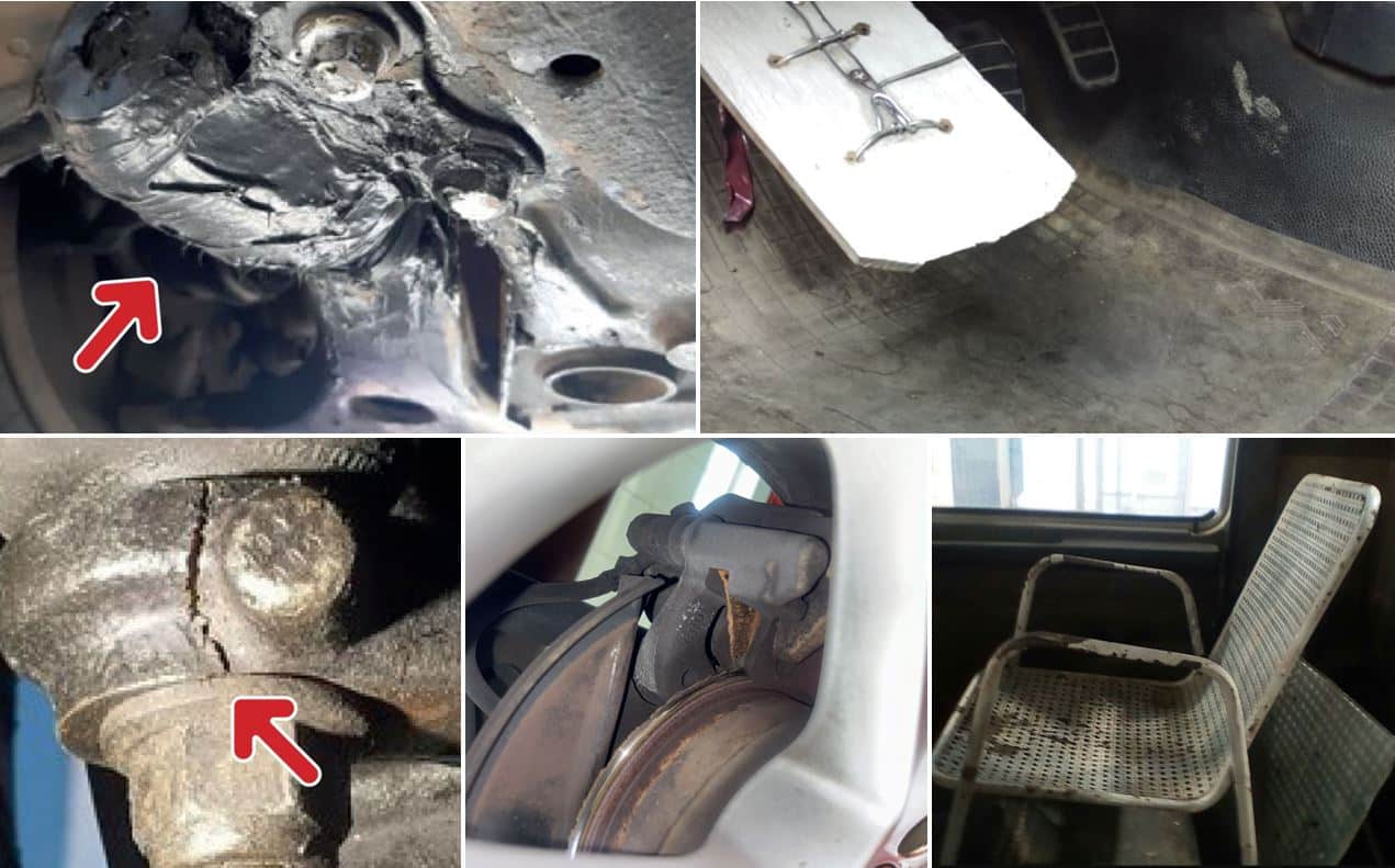 Además de estas imágenes, también se han presentado otras que muestran defectos graves en el capítulo de identificación, de dirección, de motor, emisiones contaminantes y alumbrado y señalización, entre otros. Faros cogidos con alambres, partes de la suspensión pegadas con masilla, partes de la suspensión totalmente partidas y mucho más.