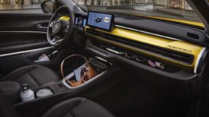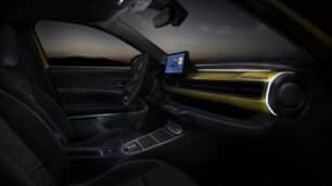 Una vez dentro del vehículo, los ojos son atraídos inmediatamente a la parte superior del salpicadero donde un solo panel horizontal incluye todas las salidas de aire, iluminación ambiental y una pantalla táctil de 10,25 pulgadas ubicada en el centro, que puede ser vista por el conductor y el pasajero. La parte inferior del salpicadero está marcada por una carcasa de almacenamiento abierta.