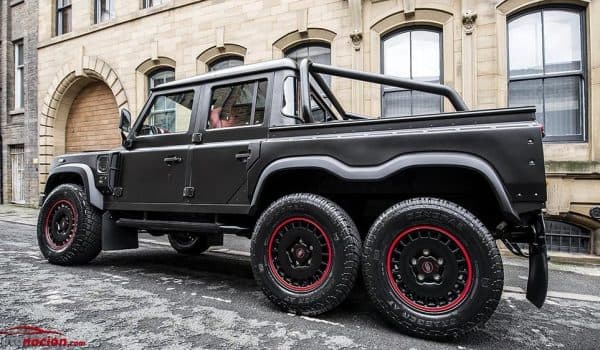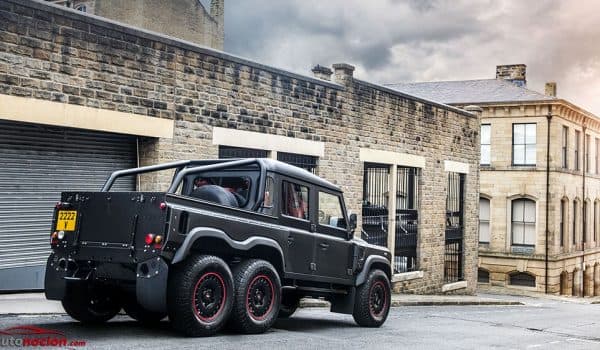 Bautizado como Kahn Flying Huntsman 110 6×6 Defender Double Cab Pick Up, el coche fue presentado este año a modo de concept en el encuentro de propietarios de Land Rover en Peterborough, armando un gran revuelo entre los asistentes. Sin embargo, a diferencia de lo que ocurría en el Defender 110 Station Wagon del preparador que vimos en Ginebra, la ornamentación exterior es algo más reducida, pero aun así comparte algunos componentes con su hermano.