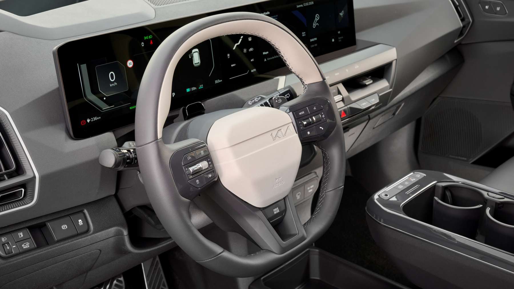 Sobre el papel, el planteamiento es bueno. Kia apuesta por un sistema con doble pantalla de 12,3 pulgadas —instrumentación y multimedia— acompañadas de una tercera pantalla de 5,3 pulgadas dedicada al climatizador. Todo bajo una misma superficie curva que queda bastante limpia visualmente.