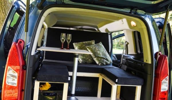 Está pensado para instalarse en algunas de las furgonetas más pequeñas de Europa en apenas cinco minutos. Ofrece gran modularidad que permite configurar un sofá, una superficie para una cama de 1,80 metros y un rincón para comer dos personas gracias a la mesa extraíble, que podemos montar tanto dentro como fuera del vehículo.
