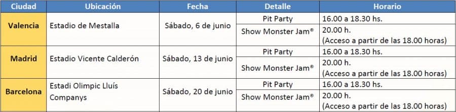 No es la primera vez que la Monster Jam® tiene lugar en España, pero sí es la primera vez que esta cita tendrá lugar en tres ciudades en una misma gira. El evento visitará Valencia, Madrid y Barcelona a lo largo del mes de junio ofreciendo a jóvenes, mayores, entendidos y principiantes del mundo del motor un show que recoge dos espectaculares competiciones.