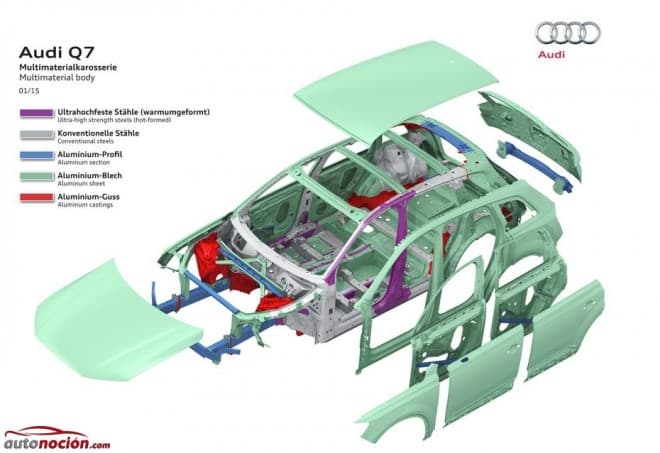 Además de los paneles de la carrocería, las aletas delanteras, el capó motor o el portón trasero, las puertas del nuevo Audi Q7 también se realizan en aluminio; sólo con las puertas, por ejemplo, el ahorro de peso es de 24 kilogramos.