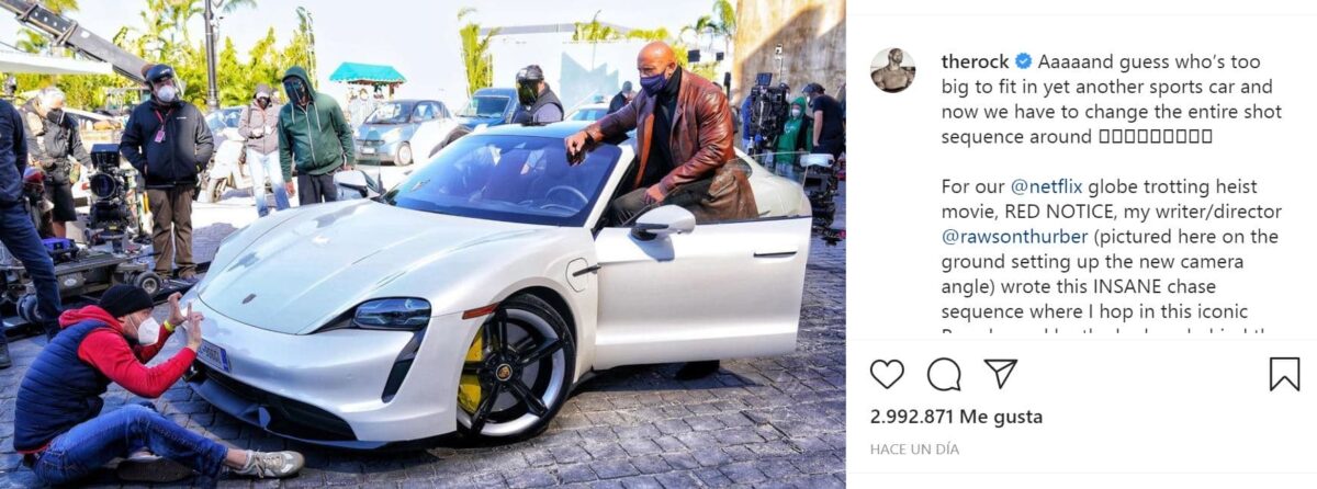 Al parecer, The Rock está en plena grabación de una nueva película de Netflix y tal y como nos hemos enterado gracias al Instagram del actor, en ella habrá una impresionante persecución en la que el mismo Dwayne debería de conducir un coche que en este caso no era ni más ni menos que el Porsche Taycan.