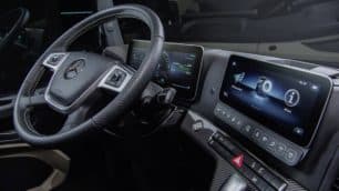 Otra de las grandes novedades es el puesto de conducción y sus posibilidades de conectividad y personalización. Ahora encontramos dos grandes pantallas similares a las de los turismos de Mercedes-Benz que brindan toda la información básica relevante para el conductor. En materia de asistencias a la conducción tampoco faltan el control de crucero adaptativo con función de parada y arranque, asistente de mantenimiento de carril, control latitudinal activo…