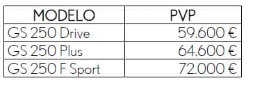 – GS 250 Drive: Modelo de entrada, pero con un completo equipamiento: Navegador, Pantalla 12.3”, Cámara trasera, Luces Bi-xenon, Smart Entry, Alarma, Asientos Eléctricos, Llanta de aleación de 17”