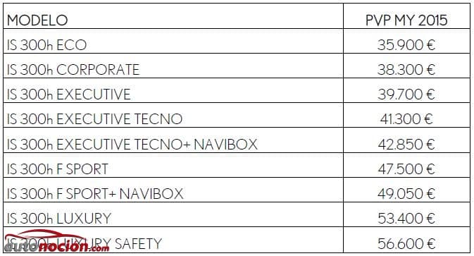 El Lexus IS 300h MY15 ya se puede adquirir en cualquier concesionario Lexus de nuestro país desde 35.900 euros. Si queréis saber todos los precios mirad la imagen que os mostramos a continuación: