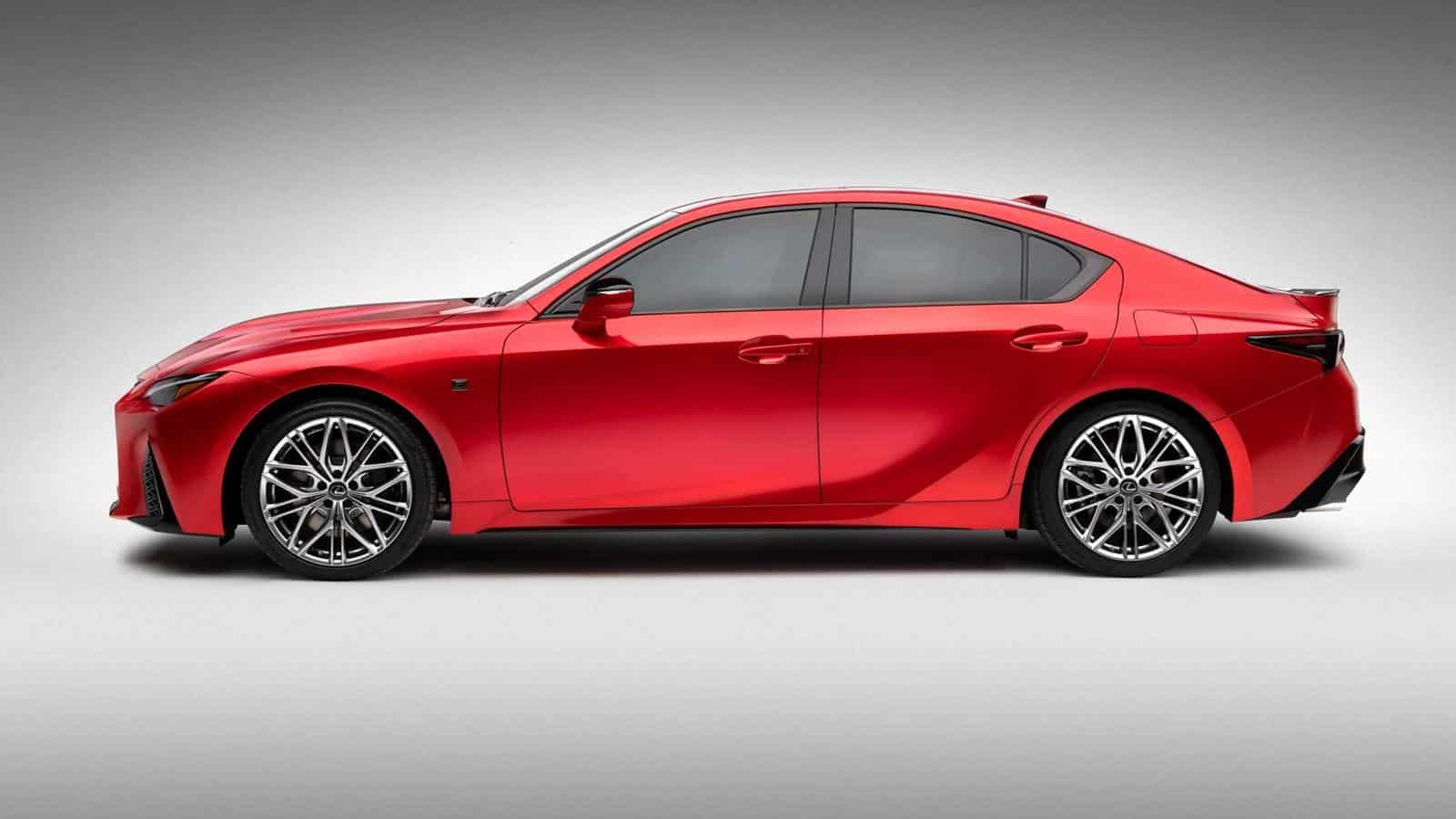 El IS 500 presenta sutiles mejoras en el exterior para ayudar a diferenciarlo del IS 350 F SPORT. El capó se ha levantado casi 51 mm y recibe líneas de carácter central esculpidas, mientras que el parachoques delantero y los guardabarros se han alargado para ayudar a acomodar el músculo V8 de aspiración natural. El IS 500 vendrá de serie con exclusivas y ligeras llantas de aleación Enkei de 19 pulgadas y 10 radios. Entre el resto de actualizaciones exteriores se incluyen acentos en el difusor trasero inferior así como las molduras de las ventanillas en cromo oscuro.