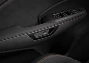 La consola central tiene una fuerte presencia con la gran pantalla táctil multimedia inclinada hacia atrás para que se integre suavemente con la estructura. La unidad tiene almohadillas laterales tapizadas y alberga dos portavasos y múltiples puntos de almacenamiento y puertos USB para conectar y cargar dispositivos.