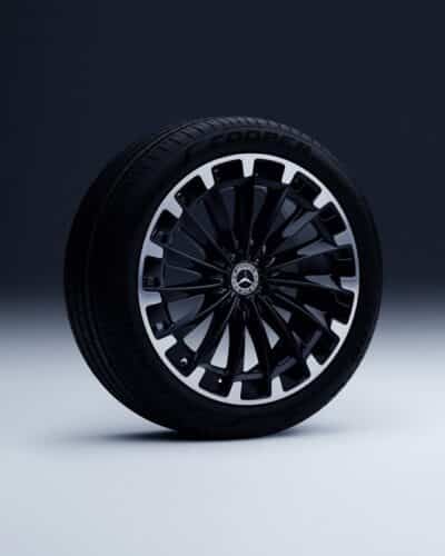 Mercedes-Benz ofrece llantas con inserciones de plástico de peso optimizado en su gama eléctrica. Las llantas, que cuentan con elementos con patrones de estrellas plateadas estampadas en caliente sobre un fondo negro tienen una apariencia particularmente llamativa.