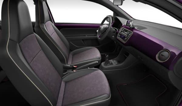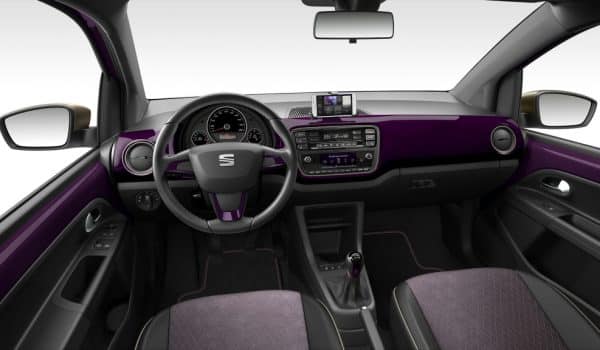 En el interior el tapizado es específico en tela de dos colores con costuras a contraste y la plancha central del salpicadero va pintada en violeta. El volante también incluye detalles en violeta y está forrado en piel, logrando un conjunto que seguro gustará al público femenino.