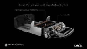 Entre los modelos que pueden derivar de esta plataforma Lotus nos ha comentado que podrá ofrecer un vehículo biplaza con una batalla mínima de 2470 mm, un biplaza con una batalla de más de 2650 mm y un deportivo 2+2 con una distancia entre ejes de 2650 mm.