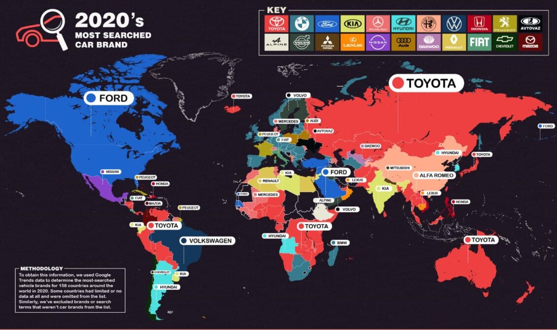 Los datos revelan los resultados de búsqueda de 158 países en 2018, 2019 y 2020. El conjunto de datos más reciente muestra que Toyota fue la marca más buscada un tercio (34,8%) de todos los países analizados, lo que representa una mejora considerable desde el 17,7%. % el año anterior. El volumen de búsqueda del fabricante de automóviles en 2020 fue de alrededor de 88,02 millones.
