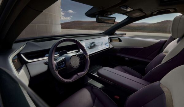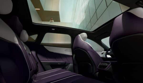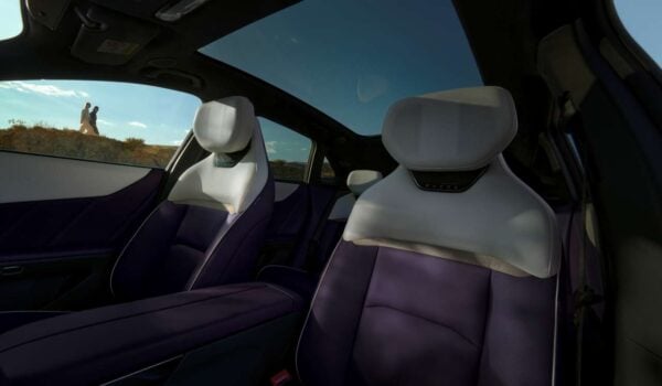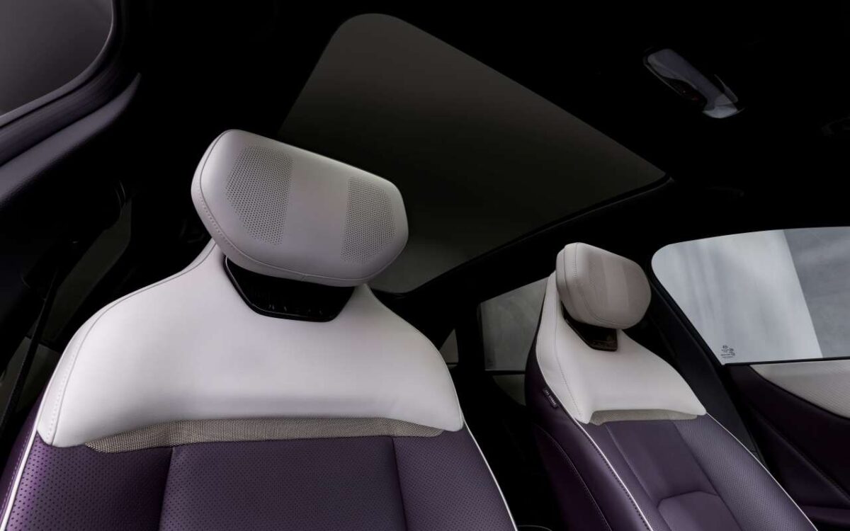 Aquí no hay cuadro de instrumentos tradicional. En su lugar, toda la información se proyecta en un head-up display de gran tamaño, algo inédito en la marca. A eso se suman retrovisores por cámara, una pantalla para el espejo interior y hasta altavoces integrados en los reposacabezas delanteros.
