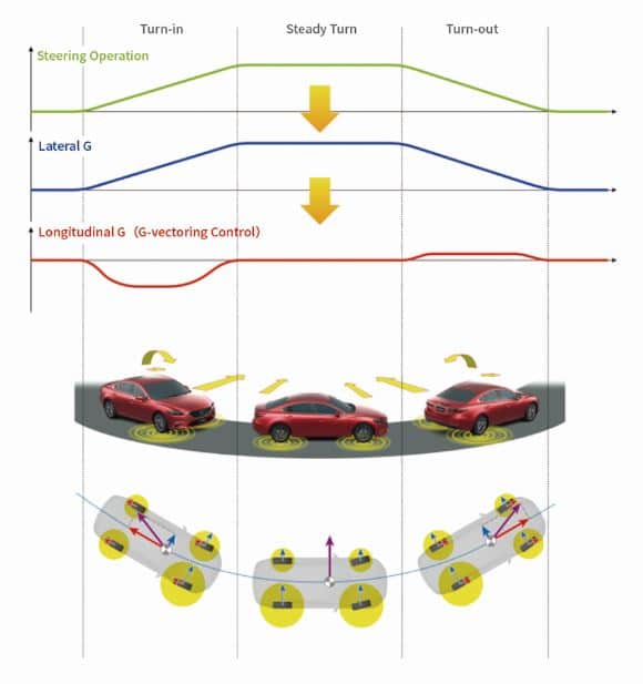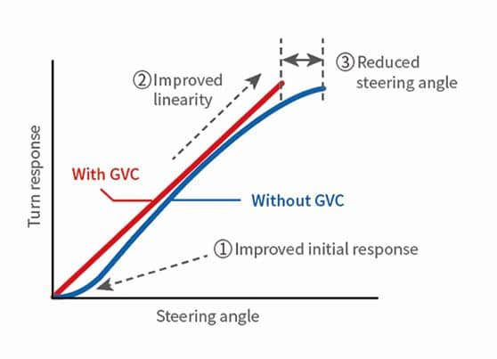 Esto mejora la tracción, inspirando una mayor confianza al conductor y aumentando la diversión de conducción. Gracias a este sistema, el comportamiento del coche es más compatible con las intenciones del conductor, por lo que también reduce la necesidad de efectuar correcciones en la dirección. Al suavizar la transición de las fuerzas el GVC aumenta la comodidad y disminuye la influencia de las mismas sobre el torso.