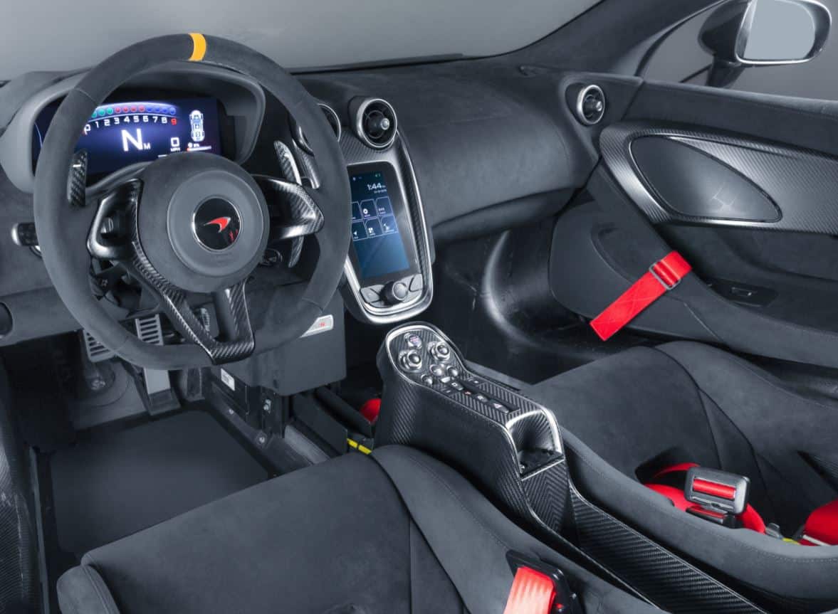 El interior de cada MSO X presenta un diseño minimalista orientado a la vía y es visiblemente diferente a cualquier otro automóvil de la serie McLaren Sports. El chasis Monocell 2 de fibra de carbono está deliberadamente expuesto, complementando los asientos bucket con carcasa de carbono, los paneles de fibra de carbono expuestos y un mamparo de fibra de carbono hecho a medida que presenta un espacio de almacenamiento para un casco de carreras.