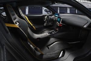 – El interior ergonómico tiene espacio para dos ocupantes. Los asientos bucket con respaldos ajustables se integran en el monocasco. Los pedales y el volante son ajustables, permitiendo al conductor adoptar la posición de conducción ideal. El túnel central separa visualmente el conductor y las áreas de pasajeros entre sí. Se integra completamente en la escultura del asiento y sigue el principio del minimalismo con su contorno suavemente creciente.