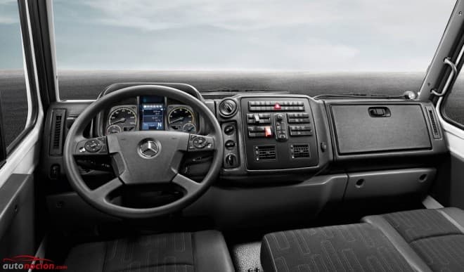 En el interior las mejoras en el Unimog se centran en el equipamiento que incluye un volante multifunción, columna de dirección ajustable, ajuste en altura de los elementos de mando, cuadro de instrumentos con una gran pantalla y un sistema de calefacción y ventilación actualizado. El cambio de posición de muchos de los controles en la consola del techo hace que sea más fácil moverse en el interior de la cabina.