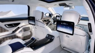 El exterior se traslada sin esfuerzo al interior del vehículo mediante el uso extendido de tonos azul náutico oscuro y oro rosa, con detalles adicionales de cristal y blanco ópalo brillante. El interior muestra la más exquisita atención al detalle. Un tejido bouclé inspirado en la moda sigue siendo una constante en todo el modelo, en tonos azul, beige, oro rosa y dorado, con detalles en las fundas de los asientos y los cojines. Los toques de cuero blanco cristal abrazan a los pasajeros en las consolas, las puertas y los cojines. Las alfombrillas están hechas de lino y mohair. Las copas de champán de color rosa dorado integran perfectamente la pantalla en la espaciosa parte trasera.