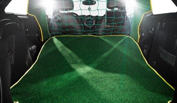 Abatiendo los respaldos de los asientos posteriores, el maletero, también cubierto de césped artificial, hace de portería que cuenta con la red justo detrás de los asientos delanteros.