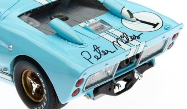 Esta célebre edición limitada a escala 1:18 está firmada por Aaron Shelby (nieto de Carroll), Peter Miles (hijo de Ken) y el jefe de equipo de Shelby American en 1966, Charlie Agapiou.