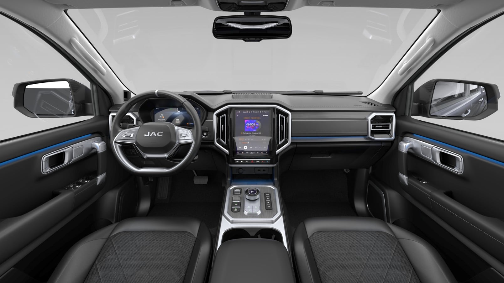 El interior del JAC Hunter está basado en su hermano diésel, el JAC T9, con un sistema de infoentretenimiento con pantalla vertical de 10.4 pulgadas compatible con Apple CarPlay y Android Auto, además de un cuadro de instrumentos digital de 10.25 pulgadas.