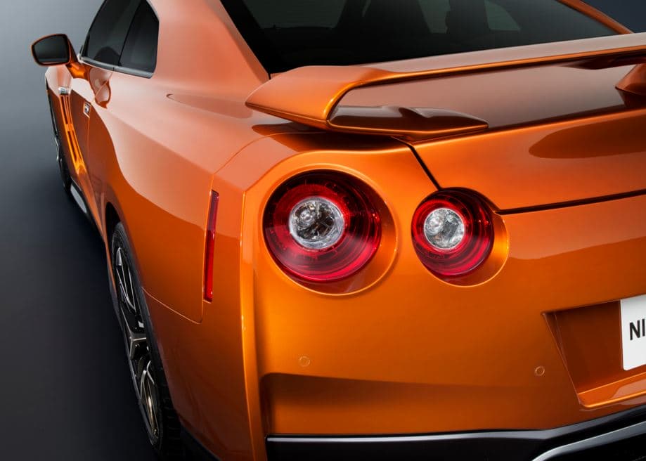 – La familiar forma aerodinámica del GT-R define su perfil, con los faldones laterales ahora más prominentes para mejorar el flujo de aire. La parte trasera también ha sido extensamente modificada, manteniendo los inconfundibles y emblemáticos faros traseros. Un vistazo más detallado revela mejoras en la carrocería para favorecer el flujo de aire, además de entradas de ventilación laterales situadas al lado de la cuádruple salida de escape. La línea de cintura que separa la parte inferior en negro del panel de la carrocería se ha elevado, para aportar un aspecto de mayor anchura y agresividad desde la parte trasera.