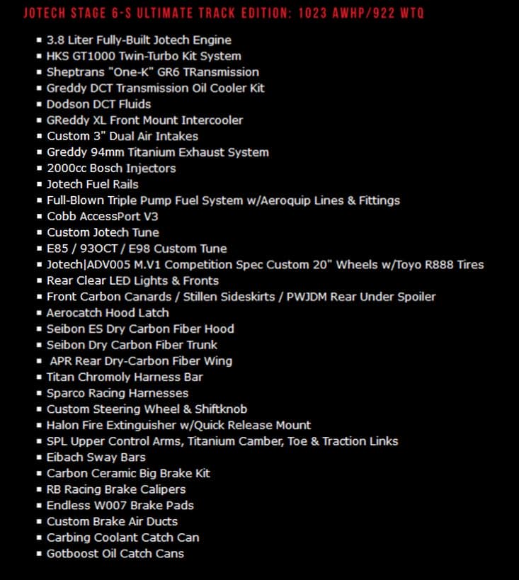 Jotech’s Stage 6 S package es un paquete que el preparador Jotech le añadió en marzo al Nissan GT-R. Con una potencia que supera los 1.000 CV –1.023 CV para ser exactos-. ¿Te parecen pocos? Bueno, te adelanto que la S significa Street y si quieres algo más radical deberás decantarte por el paquete R que ofrece 200 CV de potencia adicional, eso sí, en la misma etapa de preparación.