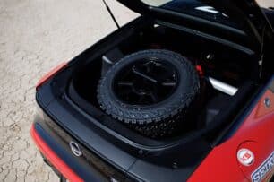 La suspensión KW Safari personalizada y las piezas de suspensión NISMO elevan la altura del coupé algo más de 5 cm, lo que ayuda a acomodar las nuevas llantas NISMO Safari de 17 x 7.5 pulgadas calzadas con neumáticos Yokohama GEOLANDAR M/T G003 aptos para tierra.