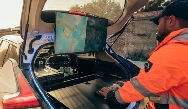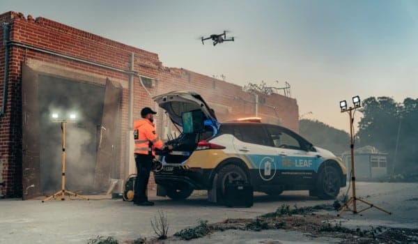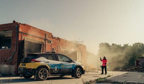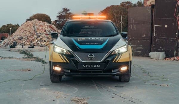 Sobre la base de un Nissan LEAF y con las modificaciones estructurales necesarias para circular por carreteras complicadas, el RE-LEAF cuenta con enchufes resistentes a la intemperie instalados directamente en el exterior del vehículo, que permiten alimentar los dispositivos de 110-230 V con la batería de iones de litio del coche.