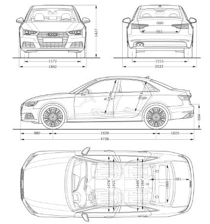 – Con una longitud de 4,73 metros y una distancia entre ejes de 2,82 metros, los nuevos Audi A4 y A4 Avant muestran una imagen de aplomo sobre el asfalto. Una línea horizontal prominente en el frontal y en la zaga subraya la anchura del coche. La longitud de la versión berlina del nuevo Audi A4 es 4.726 mm, 25 mm más que en el modelo anterior. Su anchura ha crecido 16 mm, hasta 1.842 mm y la altura no varía (1.427 mm), la más baja en el segmento Premium. Su distancia entre ejes ha crecido 12 mm, hasta 2.820 mm. El nuevo Audi A4 Avant es 1 mm más corto y 7 mm más alto que la berlina; todas las demás dimensiones son idénticas.