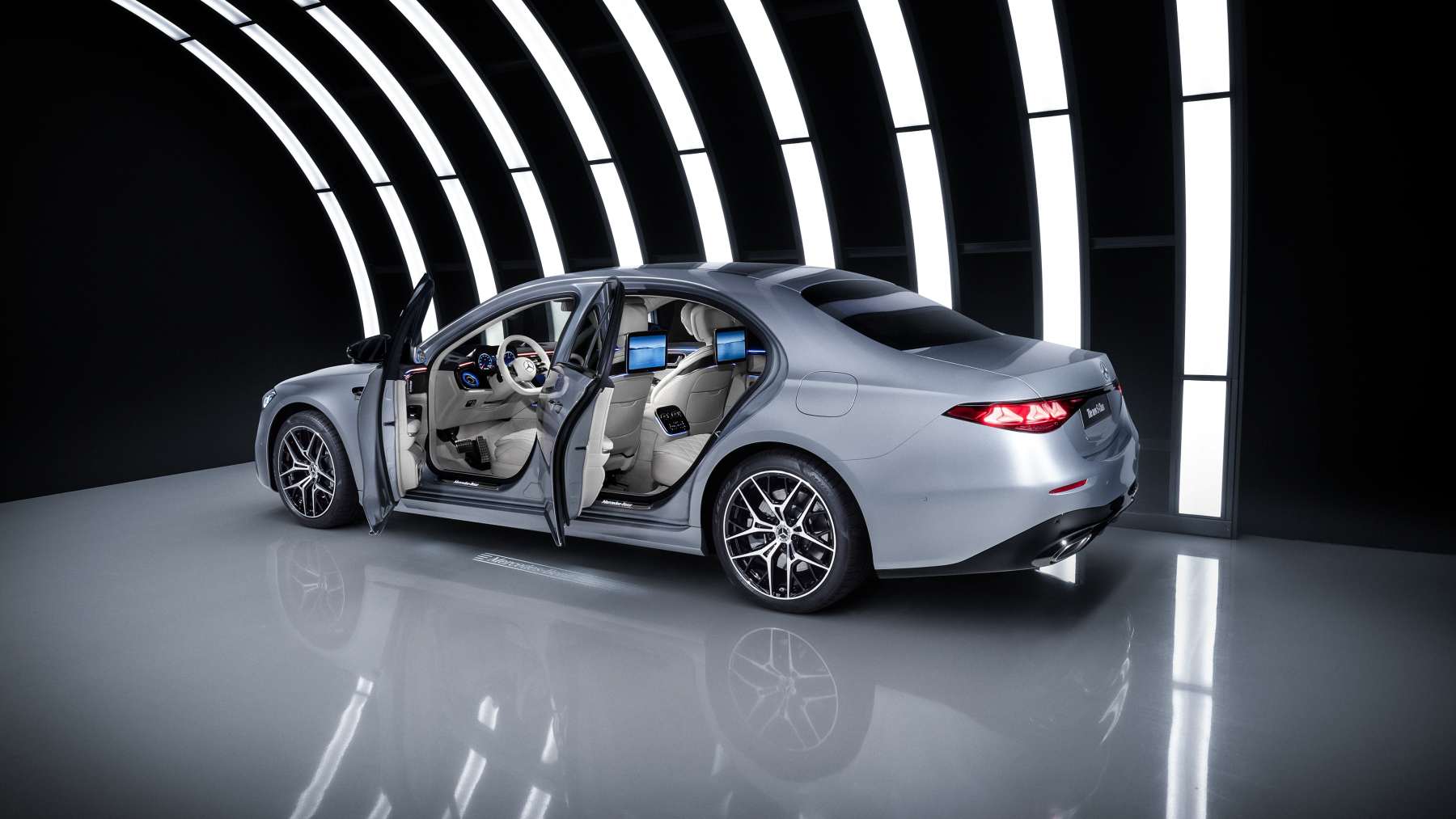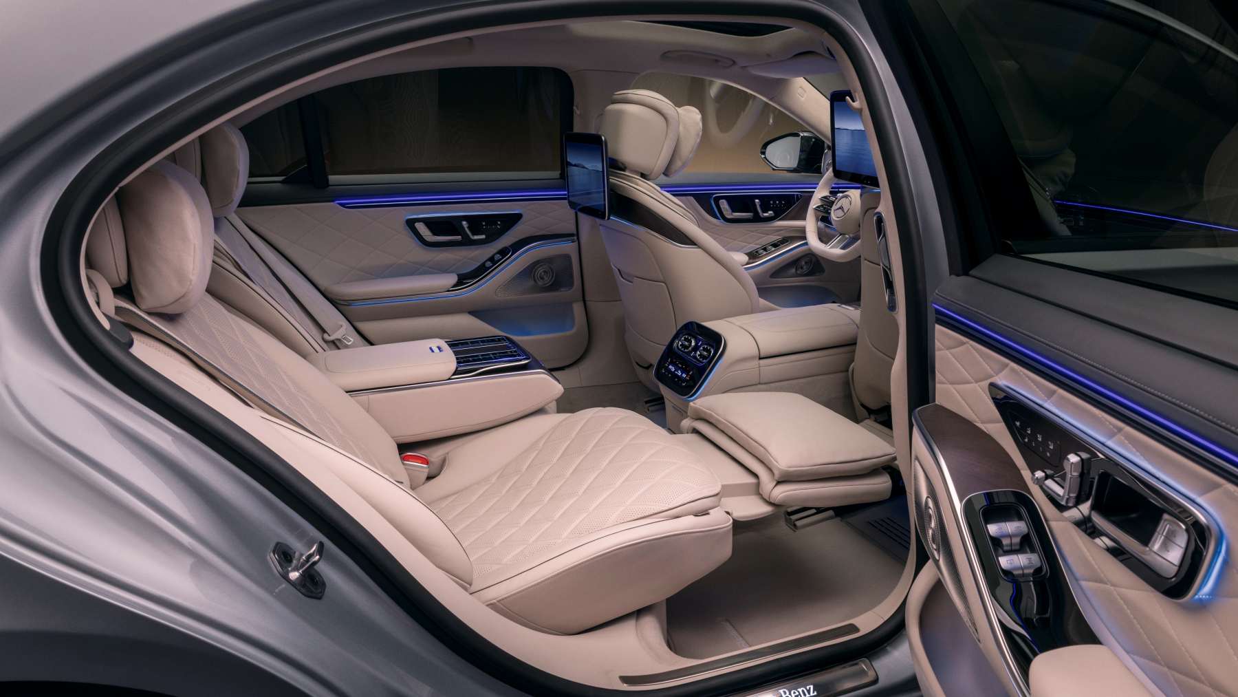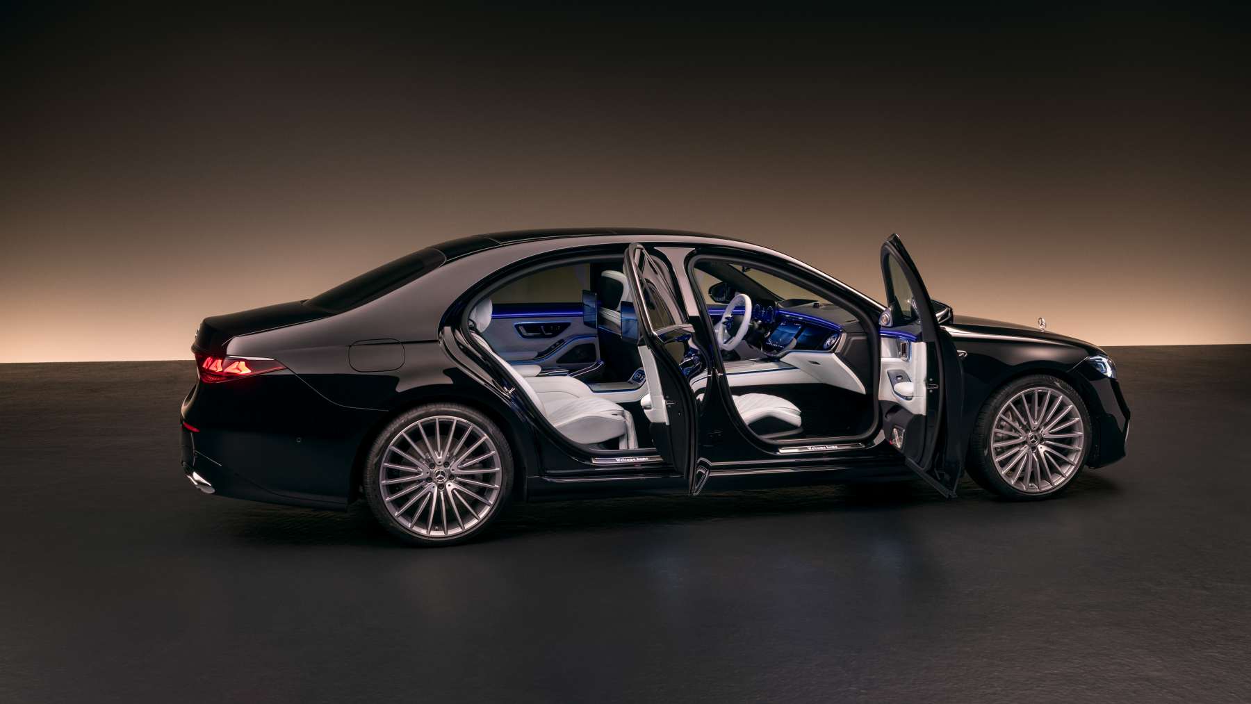 Detrás, los pilotos con las tres estrellas rematan una firma luminosa que ya es seña de identidad. Y como detalle premium bien entendido, el coche te recibe proyectando “Mercedes-Benz” en el suelo. Porque si vas a bajarte de un Clase S, que se note.