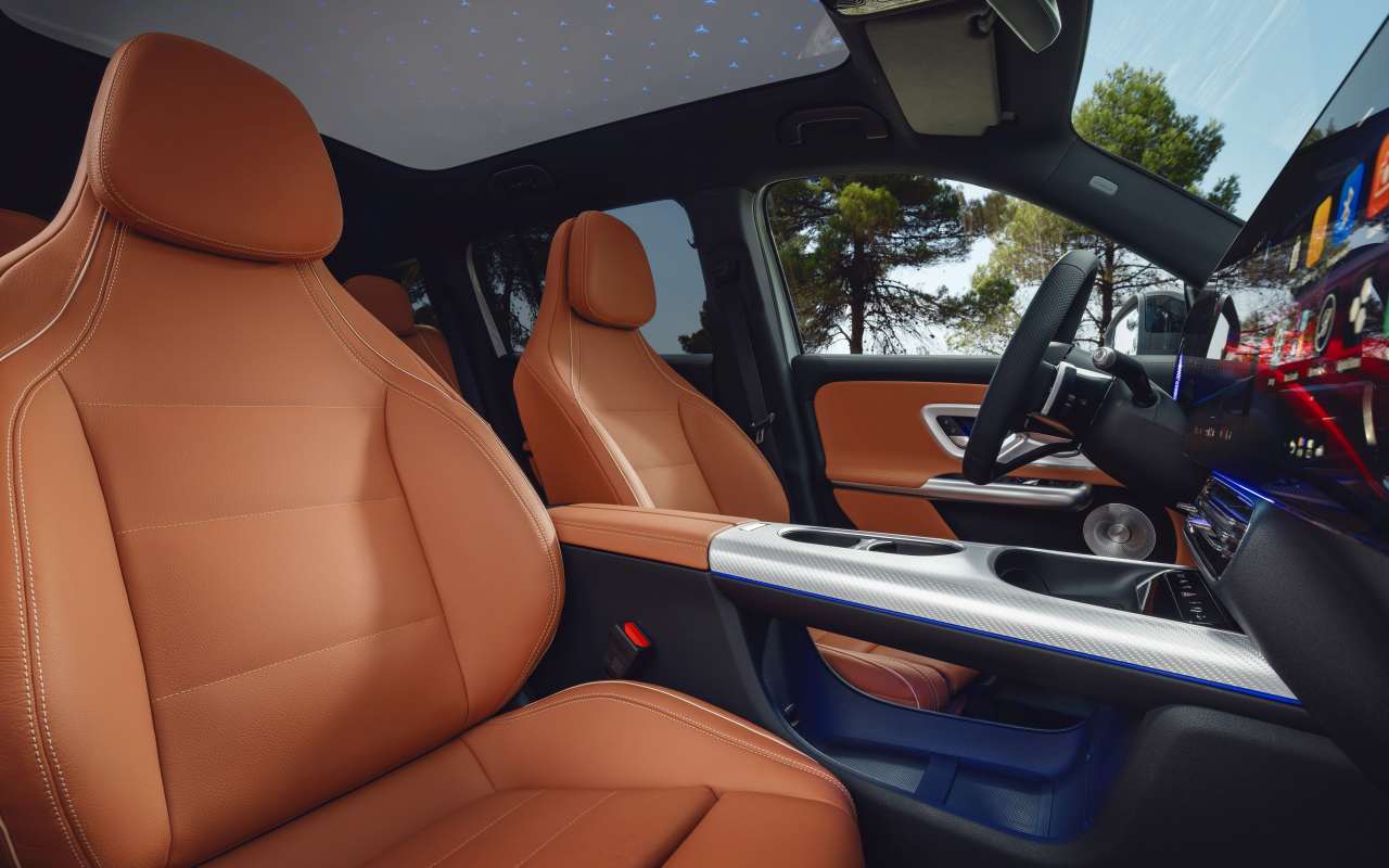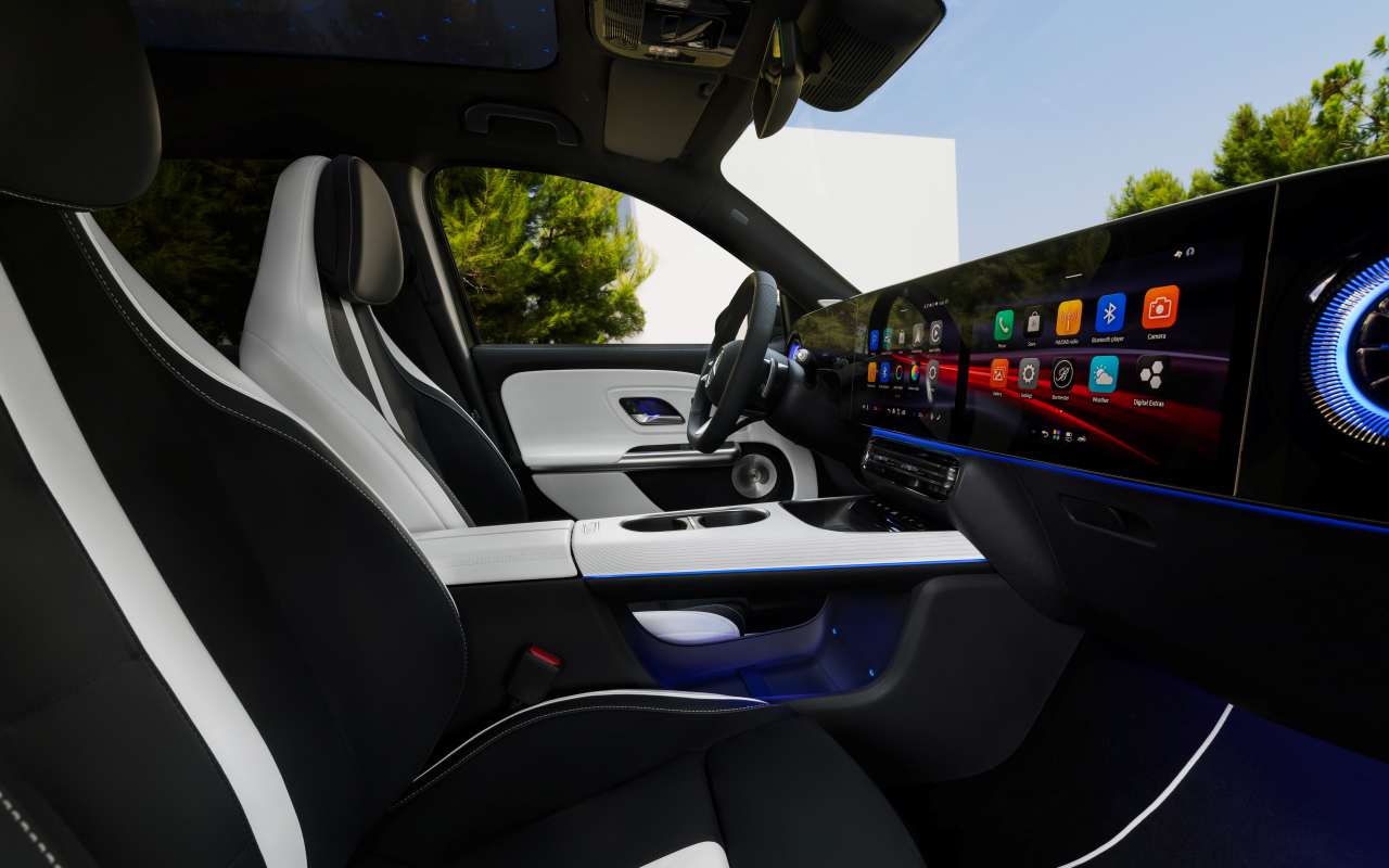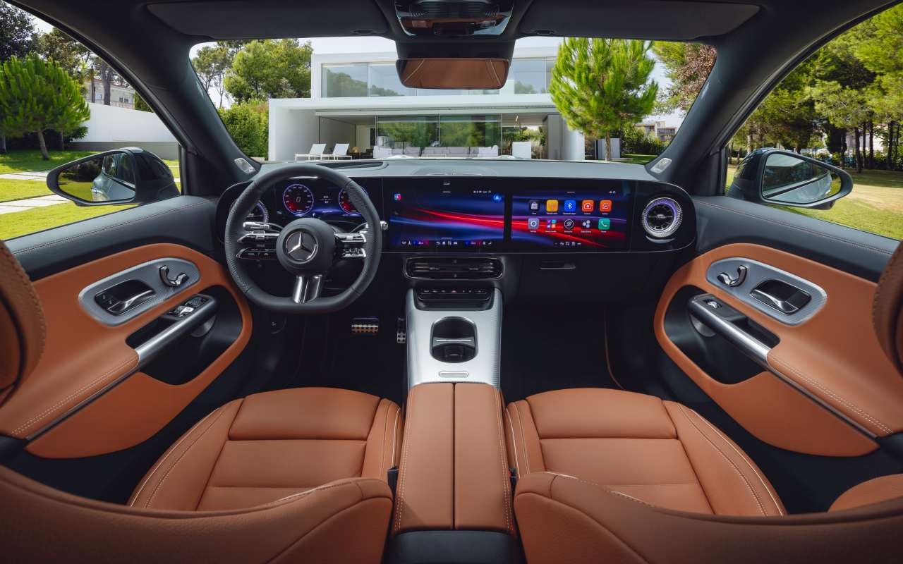 El habitáculo se presenta con la MBUX Superscreen, compuesta por tres displays: 10,25” conductor + 14” central + 14” copiloto, integrados bajo una sola superficie de cristal.