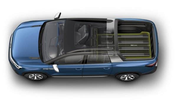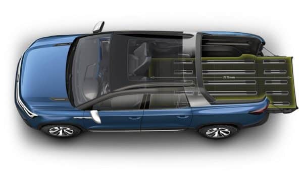 El nuevo Tarok PickUp Concept tiene una longitud de 4,91 metros y una caja posterior de 1,859 metros gracias al novedoso sistema que permite aumentar la longitud de carga hasta la cabina. Este nuevo modelo se ha desarrollado sobre la plataforma MQB y ya es el modelo más grande que la usa.