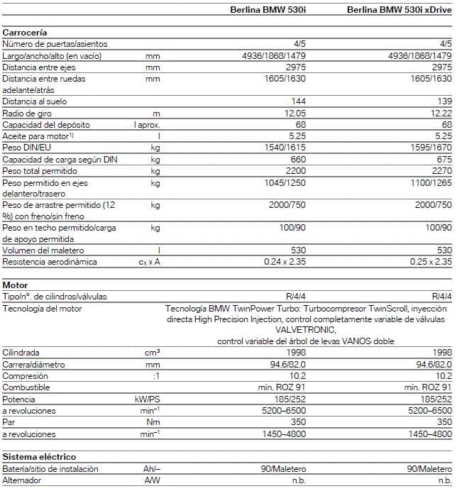 BMW 530i/BMW 530i xDrive: Motor de cuatro cilindros gasolina, Steptronic de 8 velocidades. Cilindrada: 1998 cm3. Potencia: 185 kW/252 CVa 5200 min-1–6500 min-1. Par máximo: 350 Nm a 1450 min-1–4800 min-1. Aceleración (0–100 km/h): 6.2 s (6.0 s). Consumo combinado: 5.4 l/100 km (5.7 l/100 km)*. Emisiones de CO2 combinadas: 126 g/km (133 g/km).