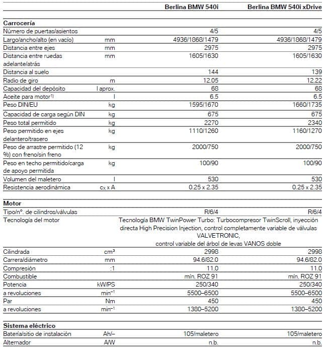 BMW 540i/BMW 540i xDrive: Motor de seis cilindros gasolina, Steptronic de 8 velocidades. Cilindrada: 2998 cm3. Potencia: 250 kW/340 CV a 5500 min-1–6500 min-1. Par máximo: 450 Nm a 1380 min-1–5200 min-1. Aceleración (0–100 km/h): 5.1 s (4.8 s). Consumo combinado: 6.5 l/100 km (6.7 l/100 km)*. Emisiones de CO2 combinadas: 150 g/km (156 g/km).