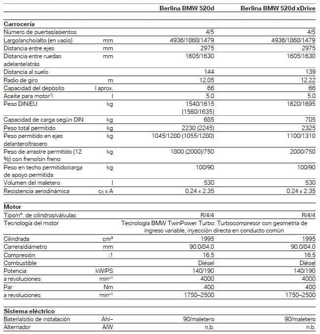 BMW 520d/BMW 520d xDrive: Motor de cuatro cilindros diésel, transmisión manual de seis velocidades/Steptronic de 8 velocidades (xDrive: Steptronic de 8 velocidades). Cilindrada: 1995 cm3. Potencia: 140 kW/190 CV a 4000 min-1. Par máximo: 400 Nm a 1750 min-1–2500 min-1. Aceleración (0–100 km/h): 7.7 s / 7.6 s (7.6 s). Consumo combinado: 4.1 l/100 km/4.0 l/100 km (4.2 l/100 km)*. Emisiones de CO2 combinadas: 108 g/km/107 g/km (112 g/km).