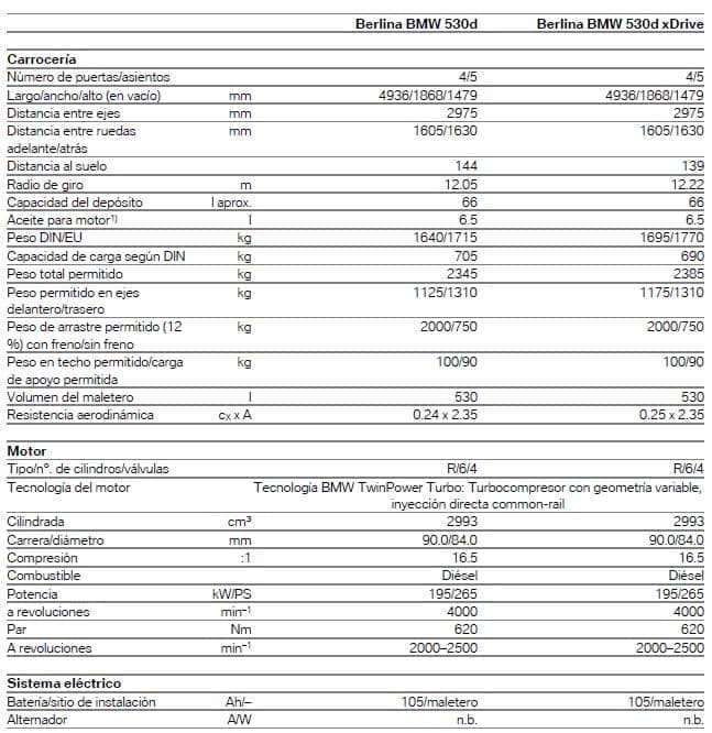 BMW 530d/BMW 530d xDrive: Motor de seis cilindros diésel, Steptronic de 8 velocidades. Cilindrada: 2993 cm3. Potencia: 195 kW/265 CV a 4000 min-1. Par máximo: 620 Nm a 2000 min-1–2500 min-1. Aceleración (0–100 km/h): 5.7 s (5.4 s). Consumo combinado: 4.5 l/100 km (4.7 l/100 km)*. Emisiones de CO2 combinadas: 118 g/km (125 g/km).