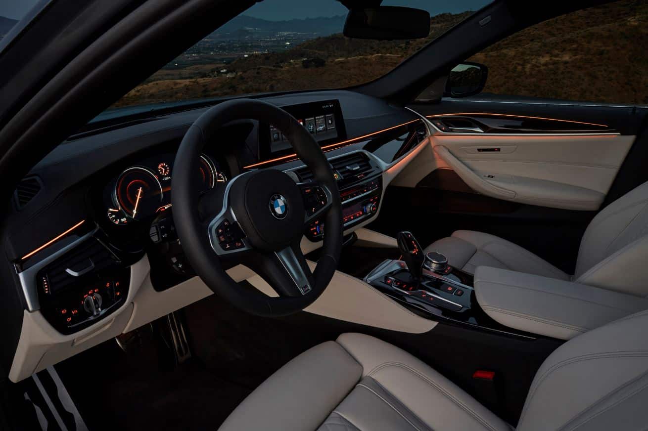 – Al igual que el resto de nuevos modelos de la marca -salvo algunas excepciones-, el nuevo BMW Serie 5 cuenta con tecnología LED de serie. Opcionalmente están disponibles los faros LED adaptativos con distribución variable de luz, que incluye luz adaptativa en curvas y asistente de luz de carretera con antideslumbramiento para un alcance de hasta 500 metros. Los pilotos traseros son LED y permiten una interpretación ligera de la forma L típica de BMW. Otro elemento característico de la parte trasera son las colas de escape, que ahora se encuentran colocados de forma siempre simétrica a ambos lados con cualquier tipo de motor. Dependiendo del tipo de motor y el paquete de equipamiento seleccionado, están diseñados con forma redonda, de trapecio o cuadrangular con cuatro tubos.