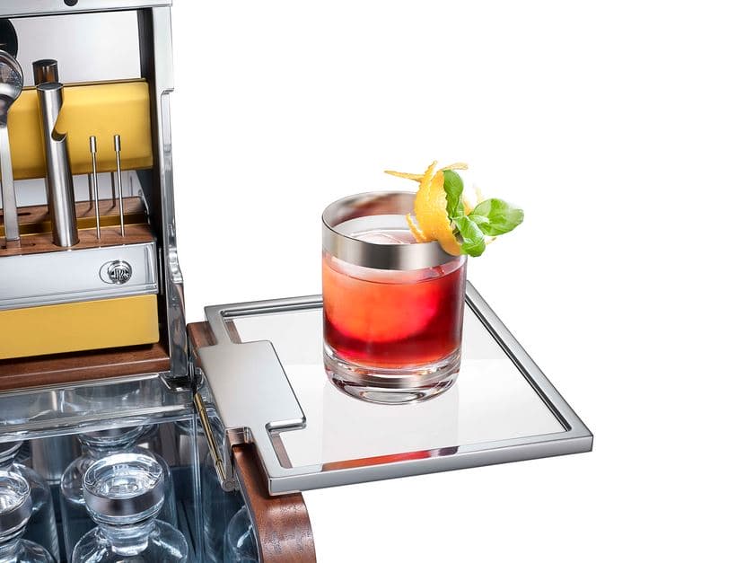 Cuando lo abrimos, una luz integrada automática ilumina cálidamente el interior, desde el contenido a la cesta pasando por las superficies de espejo que pretenden evocar la estética de un bar de cócteles de lujo.