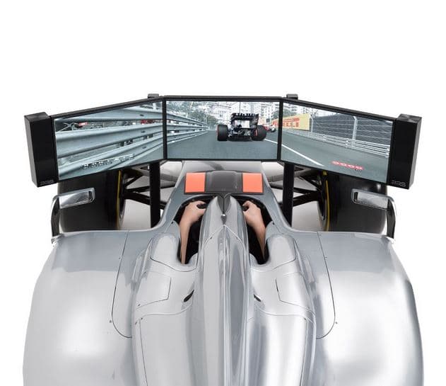El sistema está compuesto de tres pantallas planas de 23” que generan una vista algo más envolvente. El sonido corre a cargo de un sistema 5.1 y respecto al pc que moverá el videojuego cabe decir que se trata de un Intel Core i7 con disco SSD, 16 Gb de RAM…