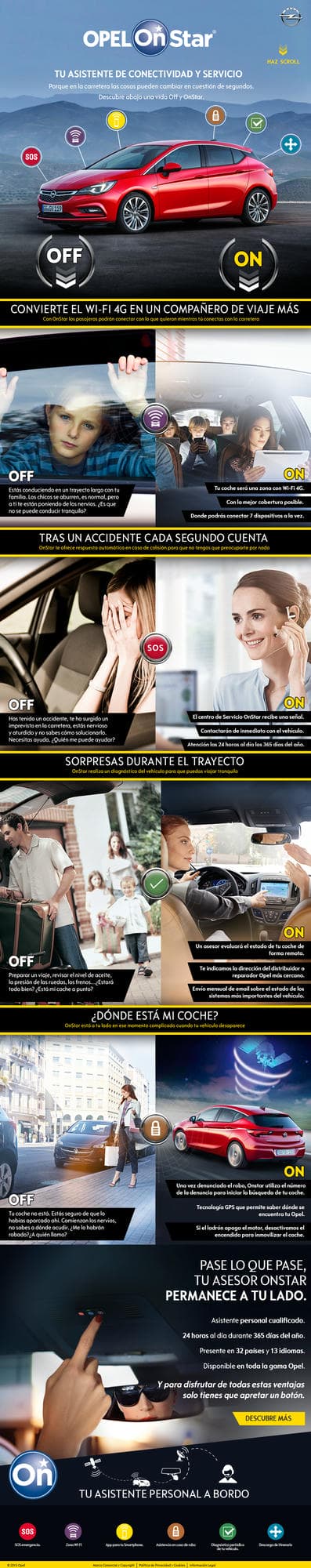 Algo similar ocurre en caso de emergencia, pudiendo ser utilizado el servicio en cualquier país de la UE, con independencia de la compañía de telefonía y automática o manualmente durante las 24 horas, los 7 días de la semana y los 365 días del año. Para su funcionamiento, el Opel OnStar utiliza los mismos sensores del airbag, de modo que en caso de accidente estos indican los datos básicos sobre la incidencia: posicionamiento mediante coordenadas de GPS, dirección, hora y tipo de vehículo accidentado. Acto seguido, un asesor –una persona real y no una máquina– contacta con el vehículo para determinar qué tipo de ayuda se necesita y, en caso de no obtener respuesta, los servicios de emergencia son enviados inmediatamente al vehículo.