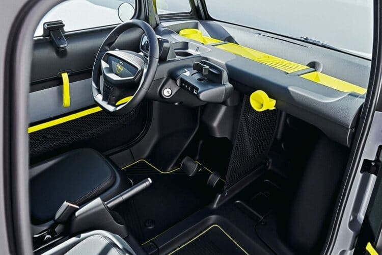 Con tan solo 2,41 metros de longitud y dos plazas, el Opel Rocks-e no necesitará carné de conducir al ser considerado un cuadriciclo ligero. Dependiendo del país en cuestión se podrán conducir desde los 14 años (15 en España) al tener una velocidad máxima limitada a 45 km/h.