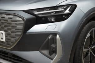 Para rematar el frontal, Audi ha incorporado varios elementos que mejoran la aerodinámica y que le dan un aspecto muy deportivo e interesante, arañando algunos kilómetros de autonomía adicionales. En la parte baja nos encontramos con una entrada de aire horizontalmente en la que se encuentra la batería de sensores de aparcamiento delanteros.